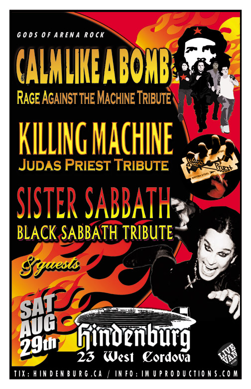 . Saturday, August 29th IMU presents CALM LIKE A BOMB Rage Against The Machine Tribute, KILLING MACHINE Judas Priest Tribute & SISTER SABBATH Black Sabbath Tribute @ The Hindenburg, 23 West Cordova . Doors 8pm / Show 9pm . Adv tix http://www.hindenburg.ca
