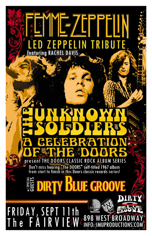 . Friday, September 11th IMU presents FEMME ZEPPELIN Led Zeppelin Tribute featuring Rachel Davis, The UNKNOWN SOLDIERS: A Celebration Of The Doors & DIRTY BLUE GROOVE @ The Fairview, 898 West Broadway . Show 9:30pm / $10 cover