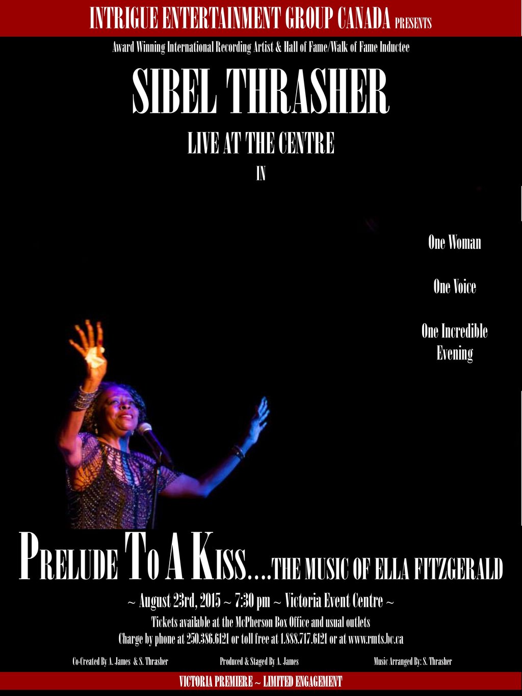 An incredible evening of music with international recording artist and hall of fame/walk of fame inductee Sibel Thrasher. Join us as we celebrate the iconic music of Ella Fitzgerald. This 2 hour concert features some of the most treasured songs ever written. One night only. For tickets contact the Royal & MacPherson Box Office at 250 386 6121 or online at www.rmts.bc.ca - Prices: low $30's to mid $40's