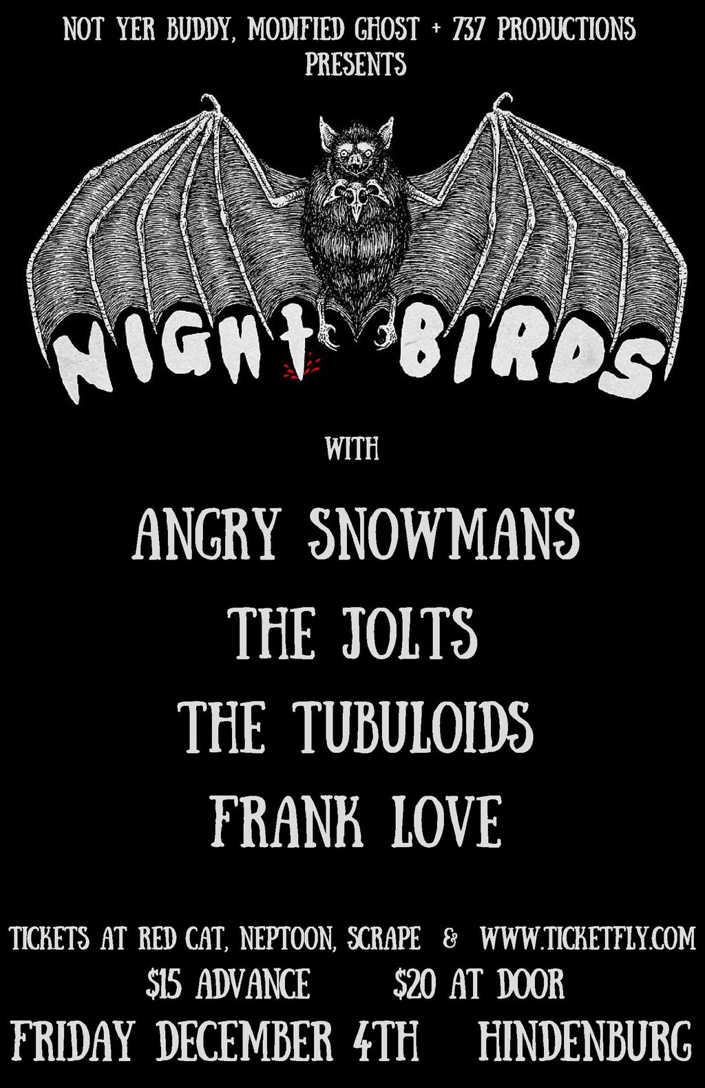 Night Birds is comprised of four thoroughly modern morons from New Jersey and Brooklyn. This high-octane surf-inspired punk rock band formed in the spring of 2009 (following the demise of bassist Joe Keller’s band, The Ergs!) While they take cues from the great hc/punk bands of 80’s like Circle Jerks, Zero Boys, Adolescents, and Dead Kennedys, they still manage to keep it new and fresh and consistently take it to that next level. To date, the band has released five 7" EPs, two LP's, one Compilation CD and now a brand spanking new full length 'Mutiny on Muscle Beach' releases worldwide Oct 2nd via iconic punk label Fat Wreck Chords! Playing nearly 300 shows all over the United States, Canada, and Europe these lads have honed their off the hook live sets to a bloody mess of perfection. If you like Seinfeld, pizza, horror movies, or any combination of the three, Night Birds may be your new favorite band.