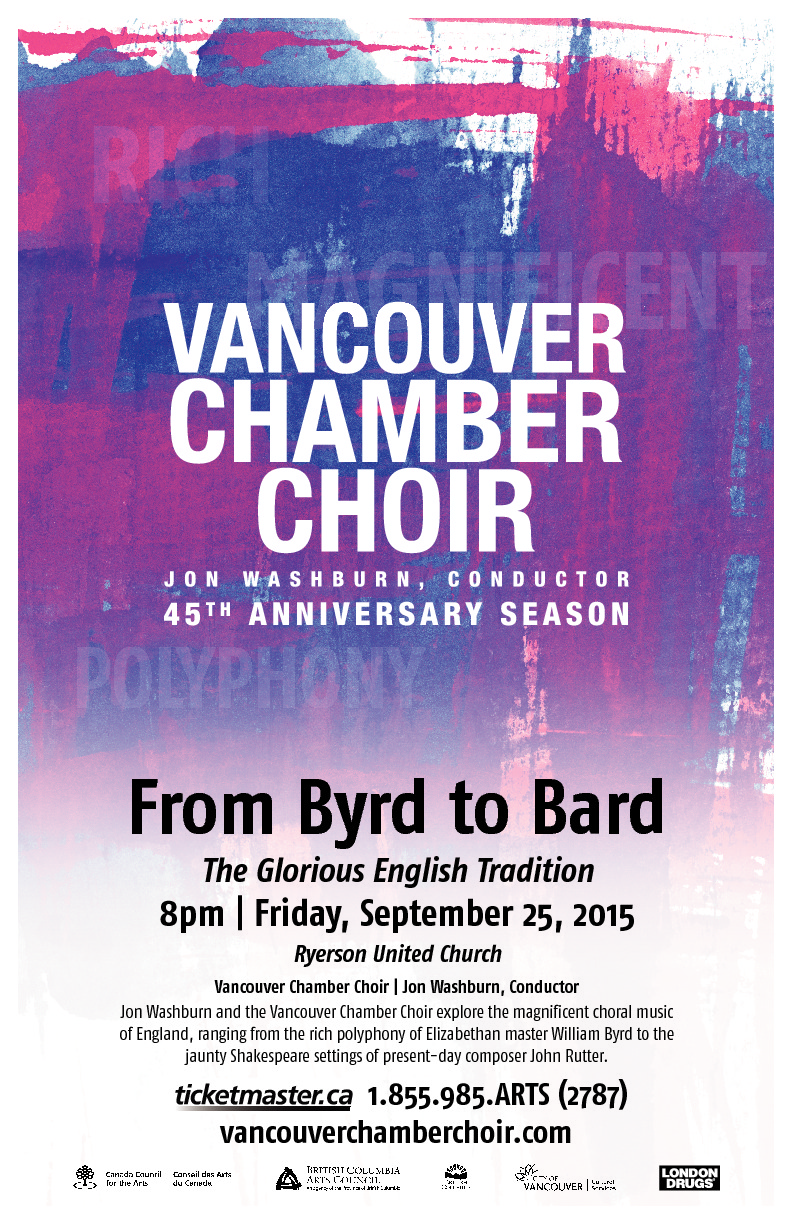 FROM BYRD TO BARD: Vancouver Chamber Choir, Jon Washburn @ Ryerson United Church Sep 25 2015 - Feb 20th @ Ryerson United Church