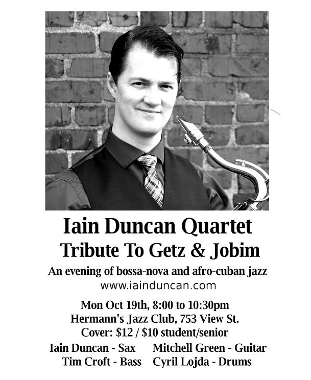 Iain Duncan and friends pay tribute to the legendary Stan Getz Bossa Nova sessions of the sixties. With Tim Croft on bass, Mitchell Green on guitar, and Cyril Lojda, drums. As recently seen at the Victoria International Jazz festival. https://vimeo.com/user29372309/videos