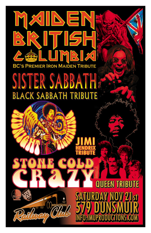 . Saturday, November 21st IMU presents MAIDEN BRITISH COLUMBIA Iron Maiden Tribute, SISTER SABBATH Black Sabbath Tribute, MIDNIGHT LIGHTNING Hendrix Tribute & STONE COLD CRAZY Queen Tribute @ The Railway Club, 579 Dunsmuir . Show 9:30pm / $10 cover