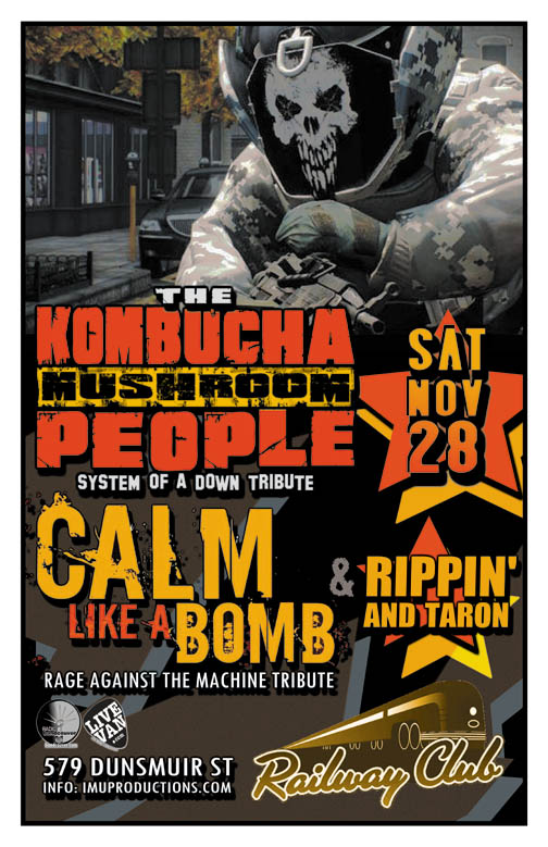 . Saturday, November 28th IMU presents The KOMBUCHA MUSHROOM PEOPLE System of a Down Tribute, CALM LIKE A BOMB Rage Against The Machine Tribute & RIPPIN' AND TARON @ The Railway Club, 579 Dunsmuir . Show 9:30pm / $10 cover