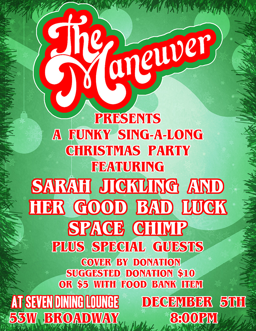 The Maneuver presents our Funky Sing-a-long Christmas Party. Joining us for the show are Sarah Jickling and her Good Bad Luck (former PPP finalist with The Oh Wells) and Space Chimp (featuring members of Fuzzcat and The Dreadnoughts). Each band will be playing Christmas songs for about half their set. We’ll be printing off lyrics booklets and encouraging the audience to sing-a-long.
