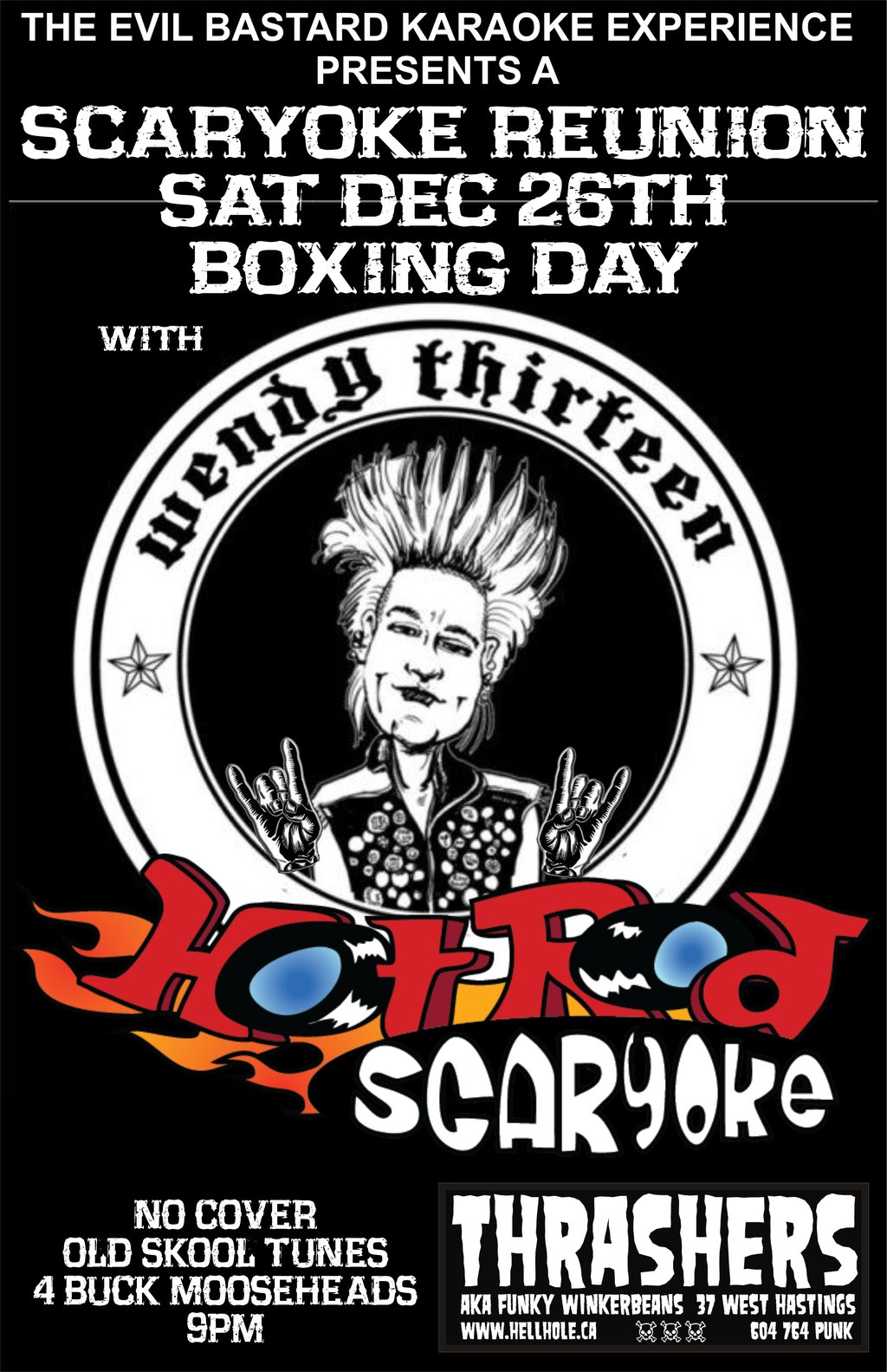 OK PSYCHOS....TAKING ONE FOR THE TEAM AND HOSTING THIS SHINDIG BECAUSE XMAS BAND BOOKING IS IMPOSSIBLE AND JOHN THE SOUND GUY DOESNT WANT TO WORK SO HE ACTUALLY GETS 12 DAYS OFF SINCE WE NEVER GET HOLIDAYS...... BOXING DAY IS THE DAY .... HAVENT DONE SCARYOKE FOR A LOOOOOOOONG TIME AND WILL BE SOBER....WISH ME LUCK!