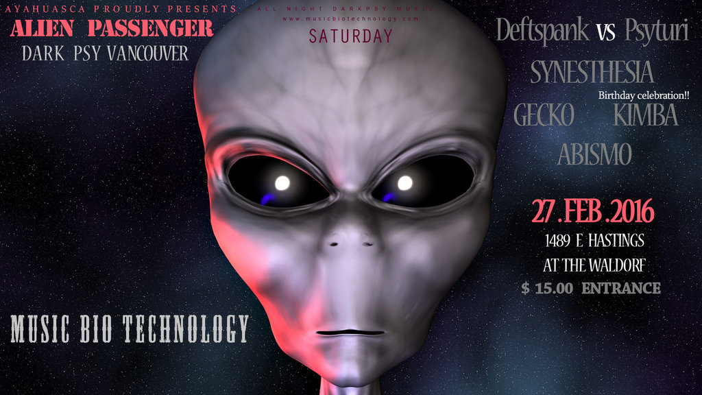ALIEN PASSENGER: Dark Psy: DEFTSPANK , SYNESTHESIA , ABISMO, Gecko, KIMBA , PSYTURI @ The Waldorf Feb 27 2016 - Feb 10th @ The Waldorf
