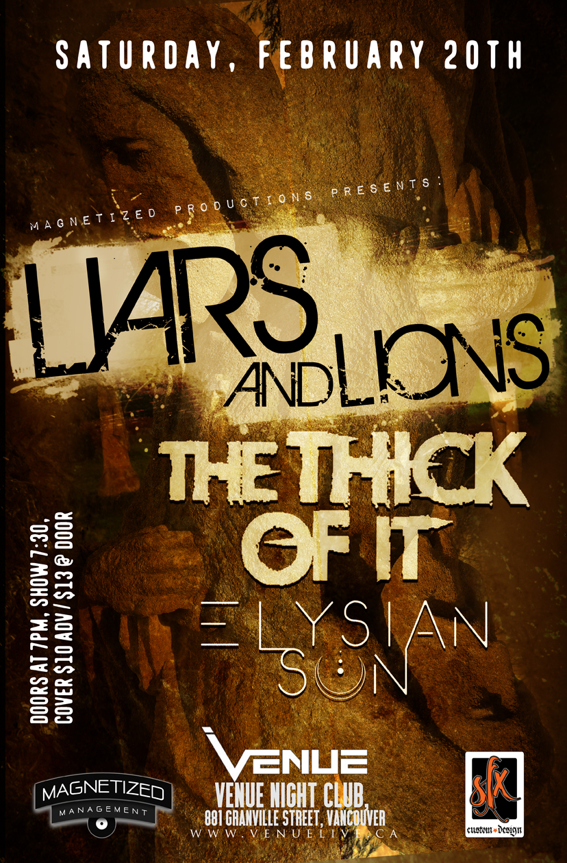 LIARS AND LIONS w/ THE THICK OF IT and ELYSIAN SUN at Venue, 881 Granville Street, Vancouver, BC. Doors at 7pm, Show 7:30, Cover $10 Adv / $13 @ Door