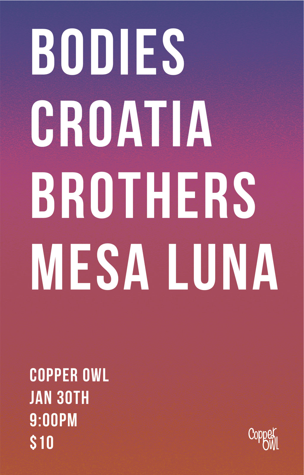 Bodies, Brothers, CROATIA, Mesa Luna @ Copper Owl Jan 30 2016 - Feb 18th @ Copper Owl