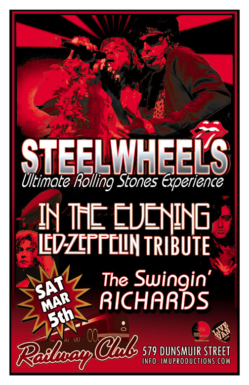 . Saturday, March 5th IMU presents STEEL WHEELS Ultimate Rolling Stones Experience, IN THE EVENING Led Zeppelin Tribute & The SWINGIN' RICHARDS @ The Railway Club, 579 Dunsmuir . Show 9:30pm / $10 cover