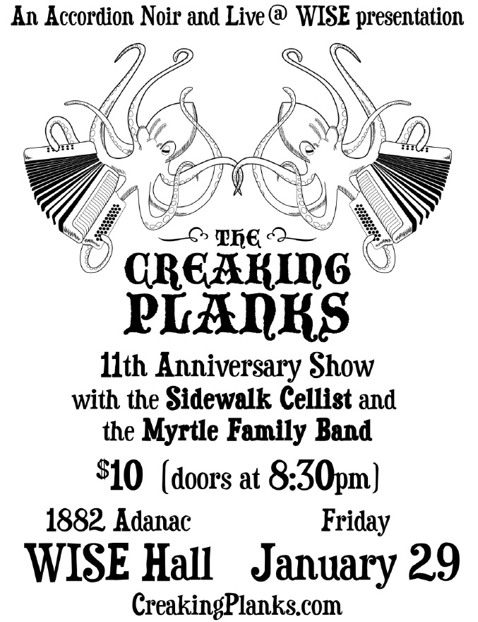 The Benedict Arnolds of the trad set, The Creaking Planks squander perfectly pleasant old-timey acoustic instruments on unlikely repertoire that ranges from inappropriately avant-garde to downright bizarre. But why? It’s anyone’s guess, but happily as it turns out, the unexpected end result is pretty fun: a mystery wrapped in an accordion wrapped in an enigma wrapped in bacon.