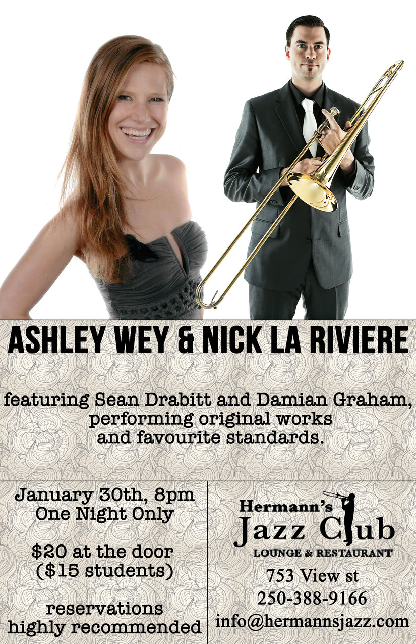 Ashley Wey sings, writes, and plays piano. Most of the year she's performing all over the world on cruise ships, but every once and a while we're lucky to have her present in Victoria. Nick La Riviere is a freelance trombonist, singer, conch shell player, and more. He plays with bands such as The Paperboys, Locarno, The Riverside, Michael Kaeshammer, The HiFi, The Yiddish Columbia State Orchestra… the list goes on. He also leads his own band performing mainly original music, and recently released his second album.