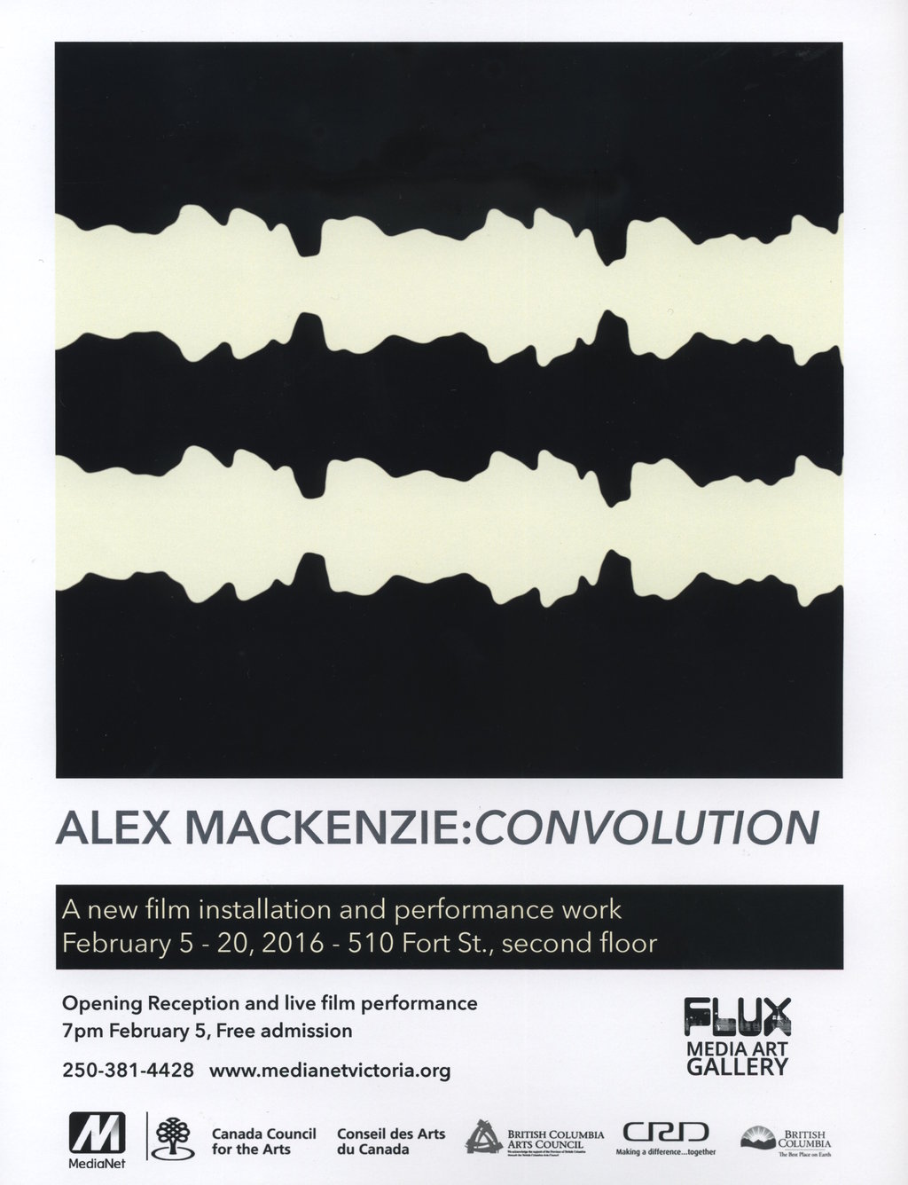 MediaNet's Flux Media Art Gallery Presents Convolution, a new experimental film installation by Vancouver artist Alex MacKenzie; exhibition opening Friday February 5, 7 pm, the exhibition will run until February 20. FLUX, located at 510 Fort Street, second floor, is open Tuesday to Saturday, noon to 5 pm.