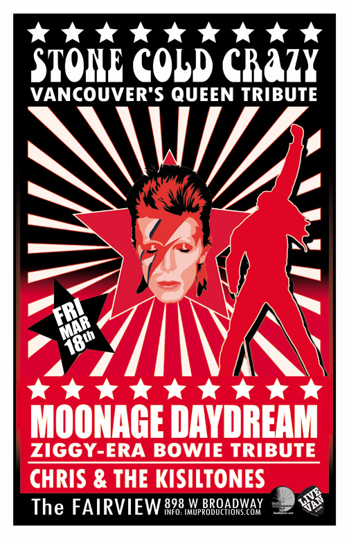 . Friday, March 18th IMU presents STONE COLD CRAZY Queen Tribute, MOONAGE DAYDREAM David Bowie Tribute & CHRIS & THE KISILTONES @ The Fairview, 898 West Broadway . Show 9:30pm / $10 cover