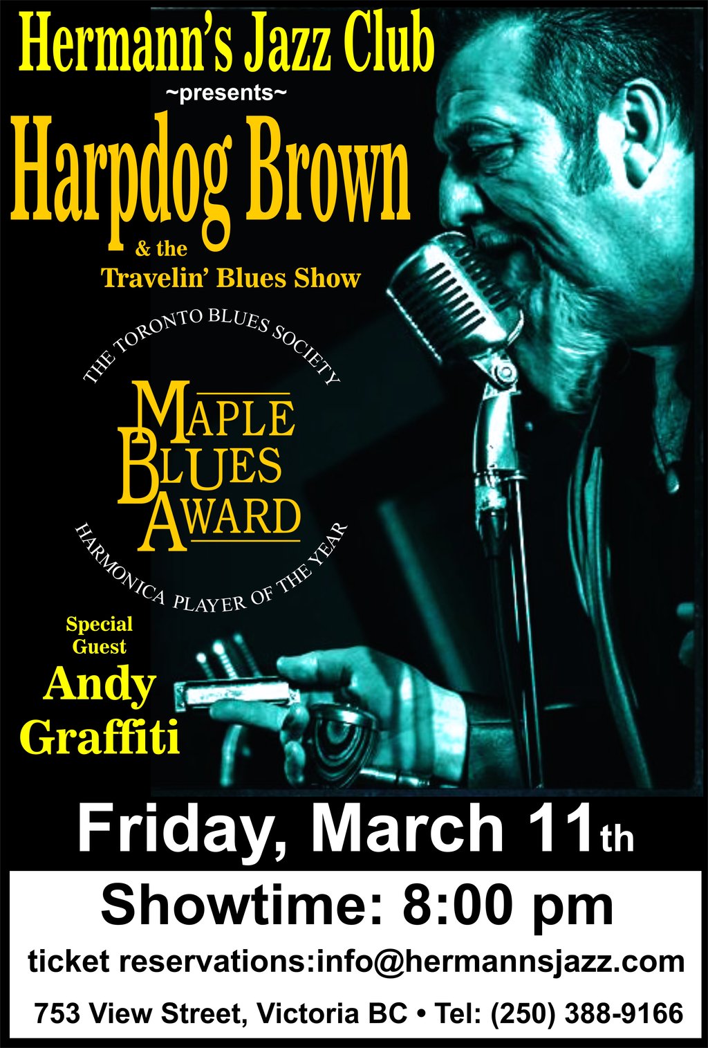 Harpdog Brown has recently won the harmonica of the year award from the national Maple Blues Awards, two years running.