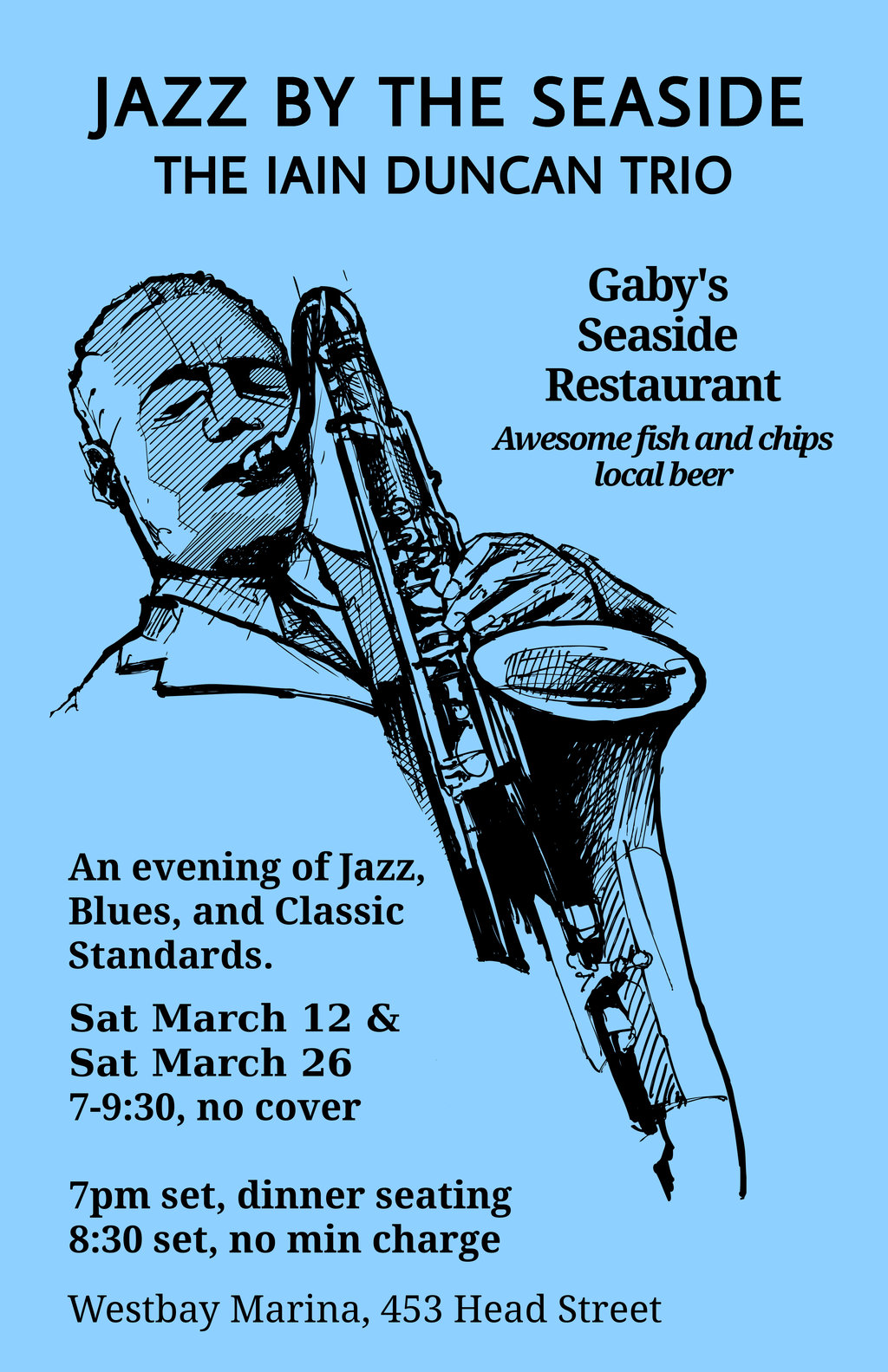 For this show we are bringing the sound of the 60's B3 Organ Soul Jazz combo to Gaby's, with the fantastic Vancouver organist Nick Peck on keys, and Victoria's guitar legend Rob Cheramy on the hollow body guitar. This is a fantastic band that I'm very excited to be playing with, hope you can make it down!
