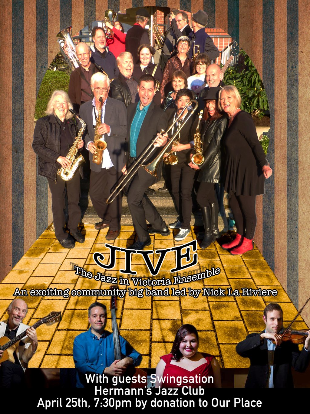 JIVE (The Jazz in Victoria Ensemble) is a collective of community big band musicians. With weekly rehearsals under the direction of trombonist Nick La Riviere, the band performs a mix of music in the big band style. Joining them are ‘Swingsation’, Victoria’s newest gypsy jazz ensemble featuring vocals by Lauren Marshall. Admission is by donation to Our Place, so it’s all for a good cause.