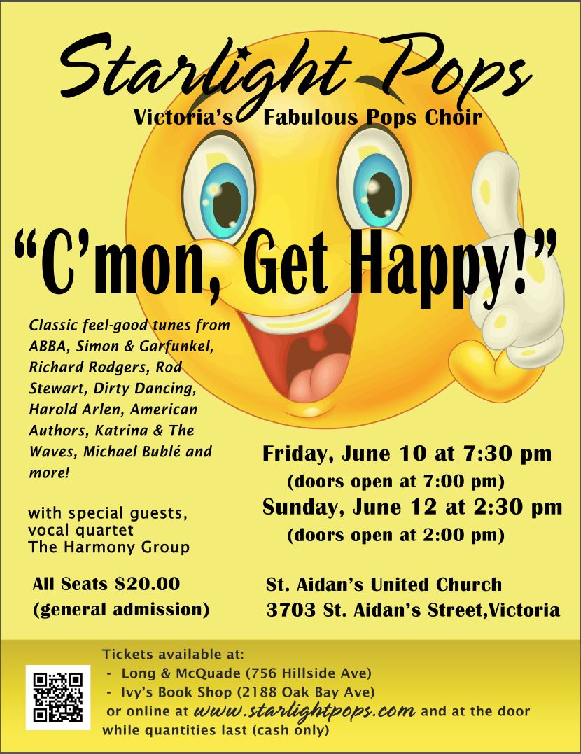 Victoria's multifaceted Starlight Pops, directed by Sue Doman, presents “C’mon, Get Happy!”, a celebration of classic feel-good tunes from some of popular music’s most beloved and enduring artists including ABBA, Katrina & The Waves, Simon & Garfunkel, Rod Stewart, Michael Bublé, The Beatles, Dirty Dancing, American Authors, and many others.