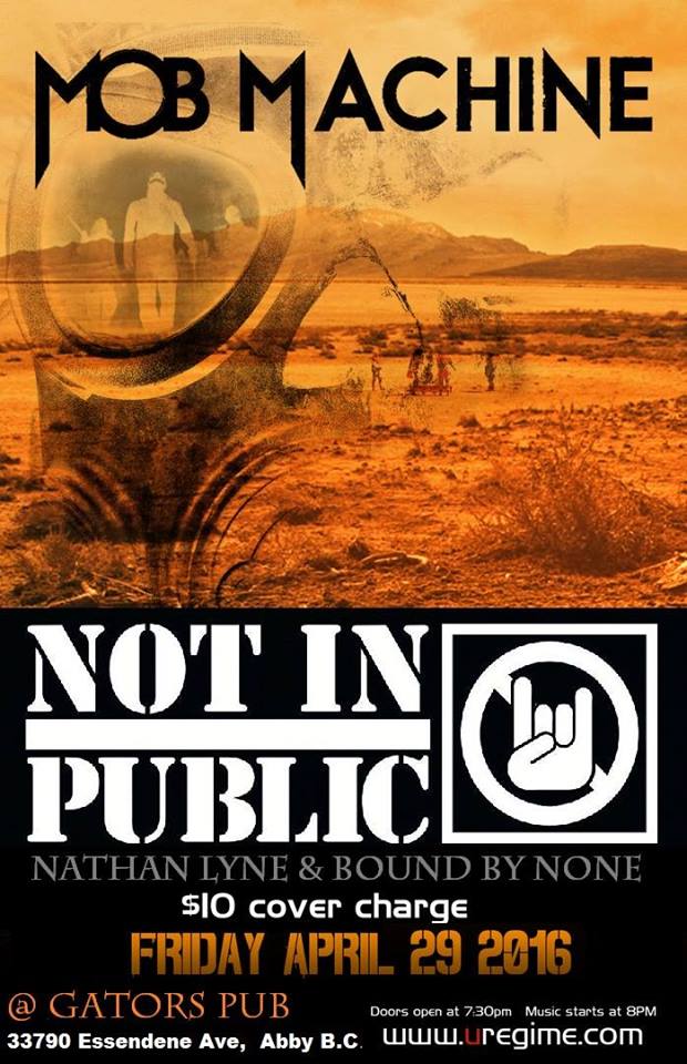 Mob Machine, NOT INPUBLIC, Bound By None, Nathan Lyne @ Gator's Pub Apr 29 2016 - Feb 23rd @ Gator's Pub