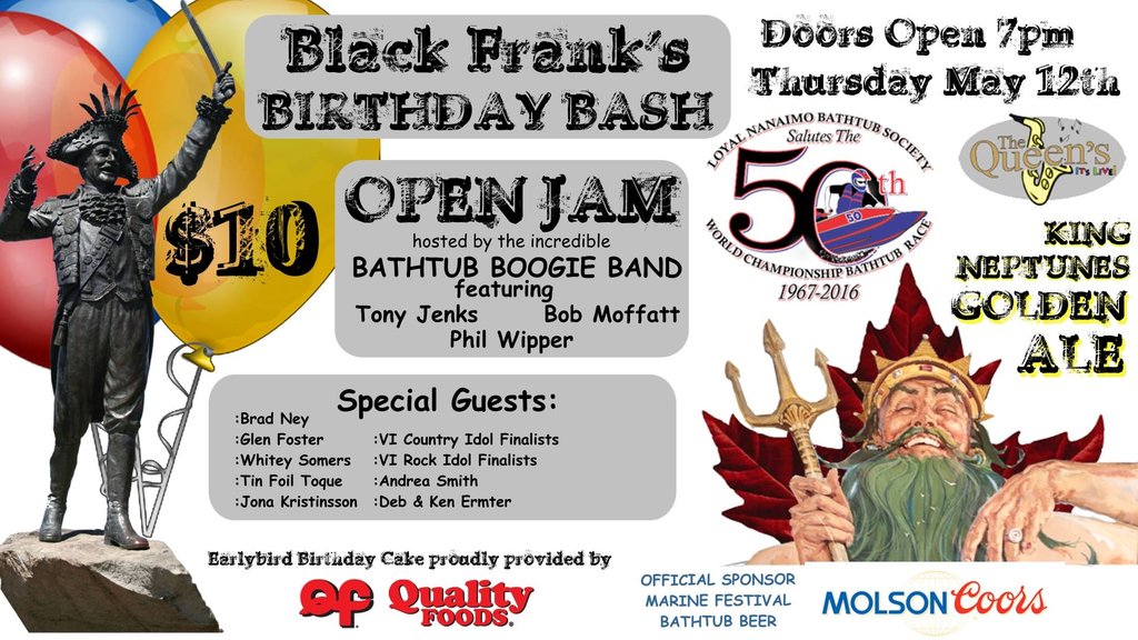 Be sure to join us Thursday night May 12th as we kick off the 2016 Marine Festival Music Series, celebrate Black Franks Birthday and launch our official Molson Marine Festival/Bathtub Beer "King Neptunes Golden Ale". Big thanks to Quality Foods for providing us with a huge Black Frank Birthday Cake.