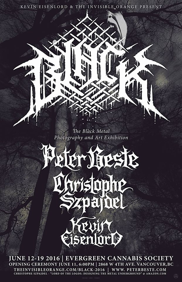 Internationally renowned photographer Peter Beste and graphic artist Christophe Szpajdel will be featured in the first installation of Vancouver’s “Black”, The Black Metal Exhibition being held from June 11 - 19 at the Evergreen Cannabis Society (2868 West 4th Avenue).