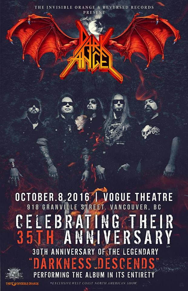 To Celebrate their 35th year anniversary and the 30th anniversary of legendary album "Darkness Descends" Dark Angel will play Darkness Descends in its entirety in Vancouver Canada October 8th 2016!