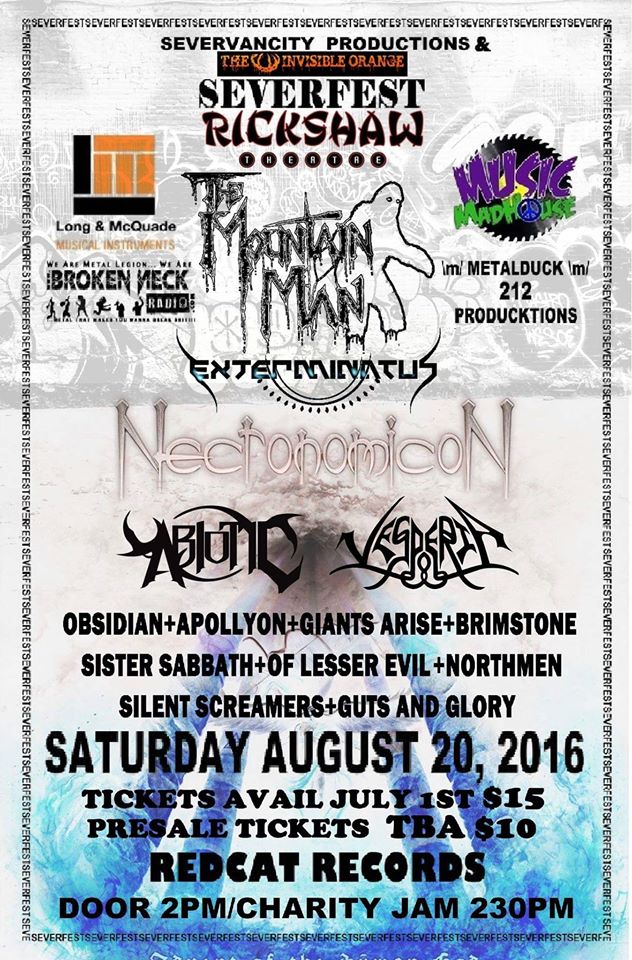 Severfest: The Mountain Man, Necronomicon, Abiotic, Vesperia, Apollyon, Exterminatus, Obsidian, Giants Arise , Brimstone, Sister Sabbath, OF Lesser Evil, NORTHMEN , Silent Screamers, Guts and Glory, The Hunter and the Potter