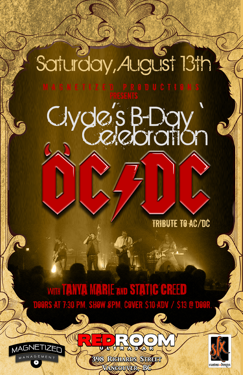 Magnetized Productions Presents: Clyde's B-Day Celebration Featuring OC/DC( Tribute to AC/DC) with Tanya Marie and Static Creed. Saturday, August 13th at Red Room Ultra Bar, 398 Richards Street, Vancouver, BC. Doors at 7:30 pm, Show 8pm, Cover $10 Adv / $13 @ Door.
