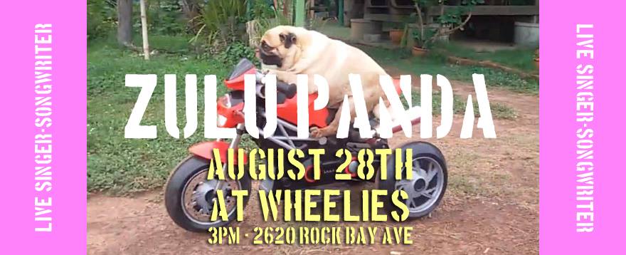 Zulu Panda is coming back to Victoria to jam out at Wheelies Motorcycles & Cafe on Sunday, August 28th from 3pm to 6pm. Come by for some great tunes and good eats.