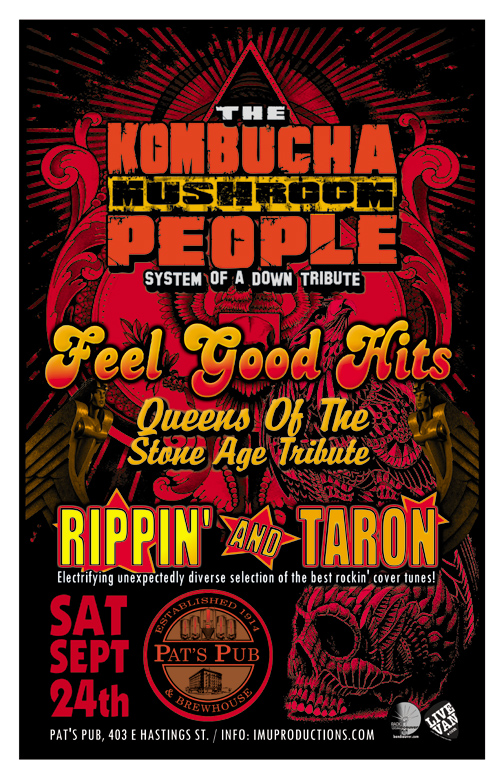 . Saturday, September 24th IMU presents The KOMBUCHA MUSHROOM PEOPLE System of a Down Tribute, FEEL GOOD HITS Queens Of the Stone Age Tribute & RIPPIN' AND TARON @ Pat's Pub 403 East Hastings Street. 9pm / $10 cover.