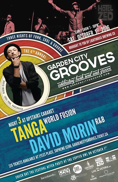 The last night of GCG 2016 is rooted in soul and latin grooves. Saturday October 1st begins with an early show at Upstairs Cabaret (7:00-10:00pm) with David Morin performing an opening set for Latin juggernaut TANGA. Anticipation will be high for both acts’ Victoria debuts, and a dance party is sure to ensue during Tanga’s lively set of cumbia, electro, Cuban and Caribbean rhythms.