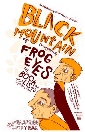 Black Mountain (featuring members of Jerk With A Bomb and Pink Mountaintops) rock. For real. They make music that sounds like the best 70's stoner rock that you've never heard. (www.blackmountainarmy.com) Advance tix available at Ditch Records.