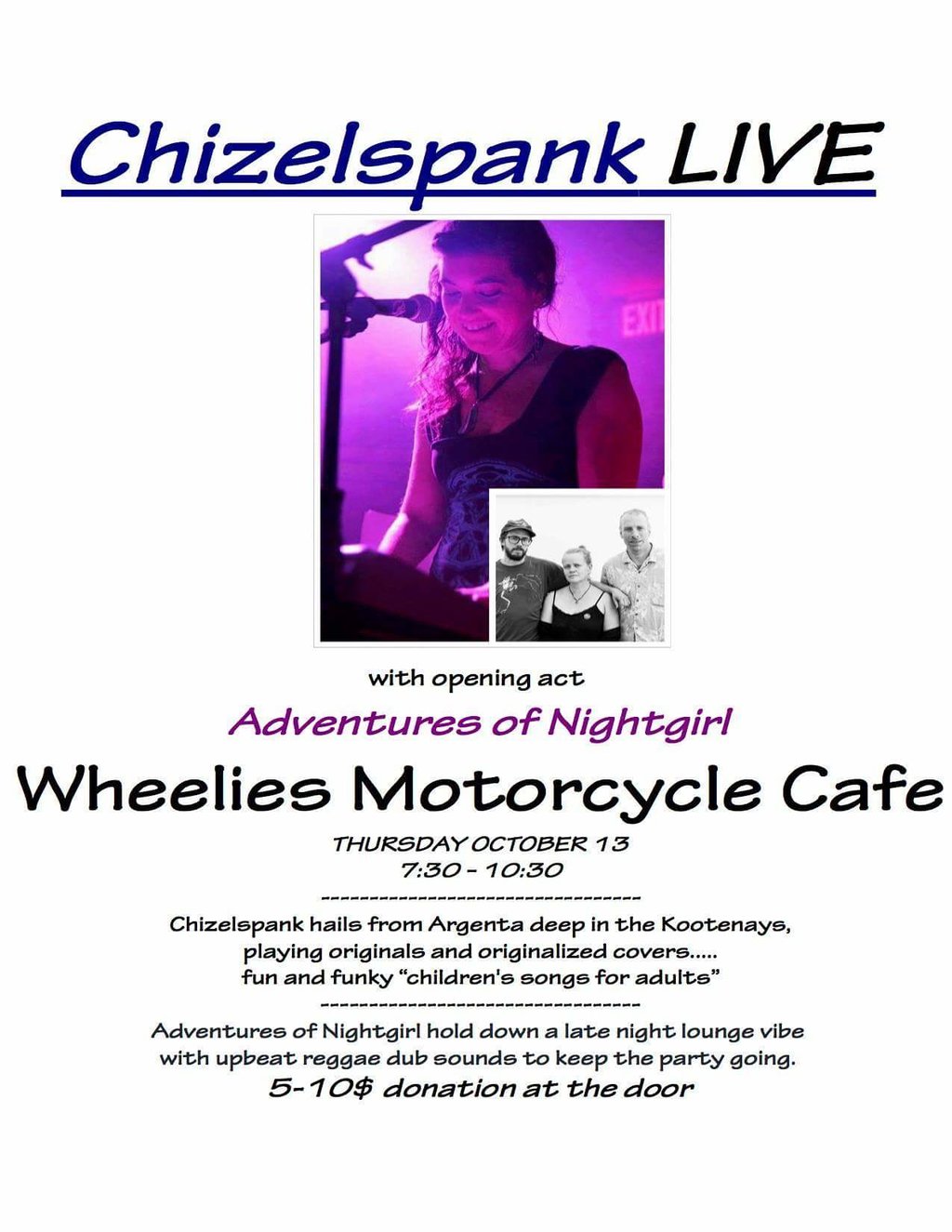 Chizelspank with Adventures of Nightgirl: Chizelspank, Adventures of Nightgirl @ Wheelies Motorcyles Dec 13 2015 - Feb 12th @ Wheelies Motorcyles