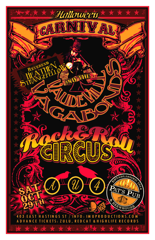 . Saturday, October 29th IMU presents HALLOWEEN CARNIVAL! REVEREND HEATHEN STRANGEFELLOW & The VAUDEVILLE VAGABONDS w/ ROCK'N'ROLL CIRCUS & AU4 @ Pat's Pub. 403 East Hastings Street. Doors 8pm / Show 9pm / $10 Advance Tickets (available Oct 7th) @ Zulu, Red Cat & HighLife Records / $13 cover @ the door
