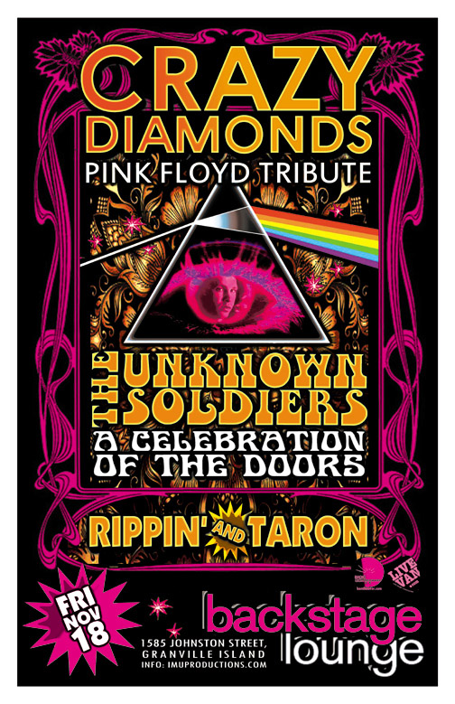 . Friday, November 18th IMU presents CRAZY DIAMONDS Pink Floyd Tribute, The UNKNOWN SOLDIERS A Celebration Of The Doors & RIPPIN' AND TARON @ The Backstage Lounge, 1585 Johnston Street. Doors 9pm / Show 9:30pm / $10 cover