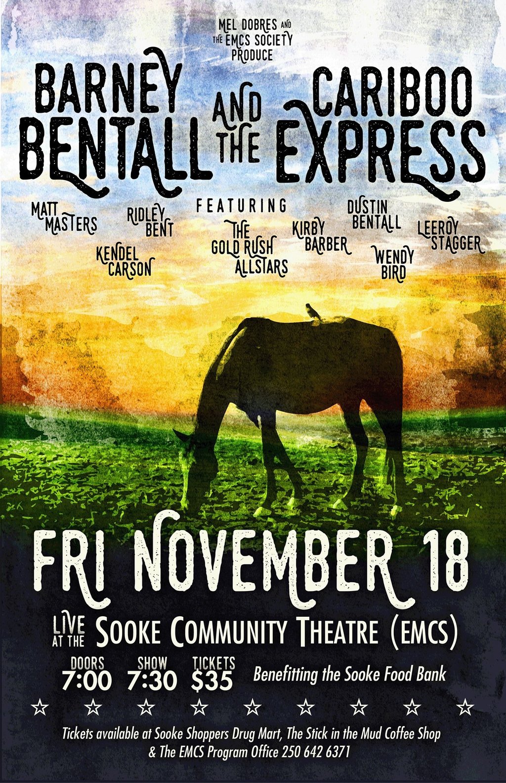 A Sooke Food Bank fundraiser, with Barney and his posse of amazing all-star musicians!!! A show not to miss!!! Tickets on sale in Sooke at: Shoppers Drug Mart, The Stick in the Mud, and the EMCS Program Office.