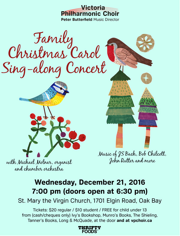 This year’s concert includes joyous music by JS Bach accompanied by a chamber orchestra and – jumping to our day, contemporary music by Bob Chilcott, a “contemporary hero of British choral music”, and by the familiar-to-many John Rutter. The audience participation songs are classics of Christmas repertoire, with soaring harmonies and descants provided by the 80 voice choir and visiting Vancouver organist, Michael Molnar.