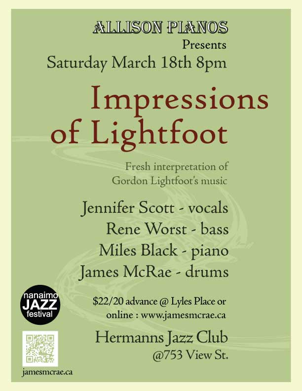 Miles Black, Rene Worst, Jennifer Scott and James McRae will be playing a fresh interpretation of Gordon Lightfoot songs collectively for the first time in March 2017. This performance(part of a 4 gig tour), happens on Saturday March 18th - 8pm @ Hermanns Jazz Club. Advance tickets can be gotten at Lyle's Place - 770 Yates, or online www.jamesmcrae.ca This performance is being kindly supported by Allison Piano's of Victoria.