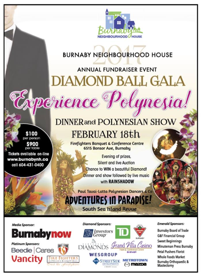 Sick of the snow and ice? Experience Polyneshia at the 2017 Diamond Gall Gala. This annual event features a fabulous dinner, an amazing show by a professional polynesian dance troup, silent auction, prize draws and so much more! Plus, Rainshadow will once again perform a great selection of favorite classic rock tunes, so bring your dancing shoes! This event is the main fundraiser for the Burnaby Neighborhood House which works with under-privileged youth, immigrant families, and seniors. The BNH is inttegral part of our community. Please come out and support them! For tickets please go to http://burnabynh.ca/diamond-ball-gala-2017/ or call (604) 431-0400
