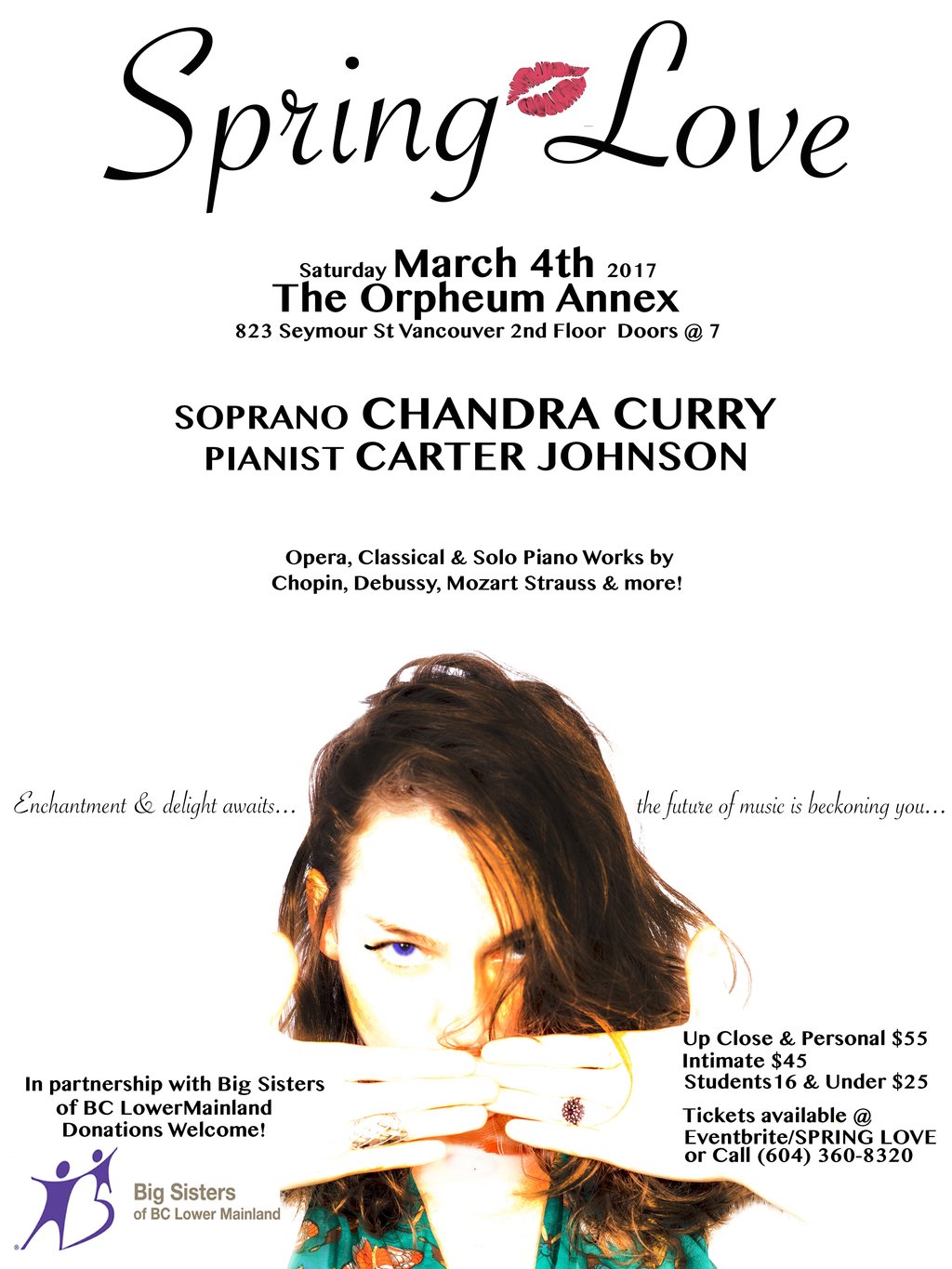 Enjoy an evening of Classical Opera. Vancouver Opera singer, Chandra Curry, singing works by Chopin, Mozart, Debussy and more. "A Magical Voice." Accompanying pianist Carter Johnson. In partnership with Big Sisters of Lower Mainland - proceeds donated to support mentoring programs