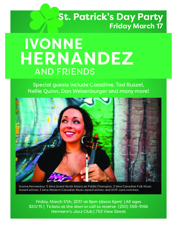 Get yer shamrocks out and come and celebrate St. Patricks Day with 2017 Juno Nominee & 5 time Grand North American Fiddle Champion Ivonne Hernandez! Fri, March 17th at 8pm at Hermann's Jazz Club in Victoria, BC.