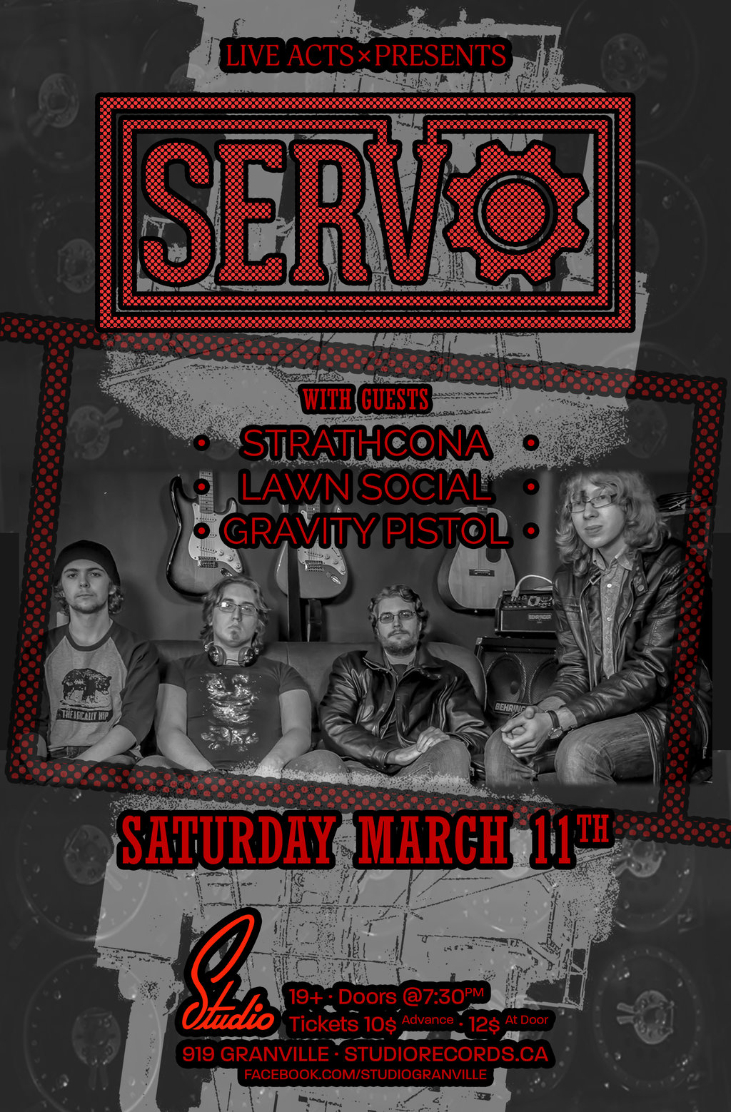 Live Acts Canada Presents Servo with guests Strathcona, Lawn Social and Gravity Pistol, March 11th at Studio Records.