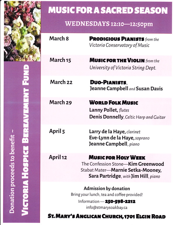 Please bring your lunch :) Admission by donation with all proceeeds going to the Victoria Hospice Bereavement Fund. Thank you Catherine Young for presenting this concert series every year with many stellar musicians taking part.