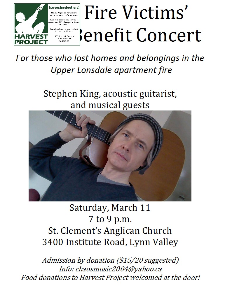 One week ago... a fire on my block left my neighbours homeless in North Vancouver. I want to do something to help so, I'm organizing a benefit concert. St. Clement's Church in Lynn Valley, has gratiously donated their beautiful space for Saturday, March 11, 7-9pm. If you would like to contribute your time or talent in aid of, please contact via email/message,ASAP. Thanks for your consideration and contribution in kind! NB: Looking for an opening acoustic based act.