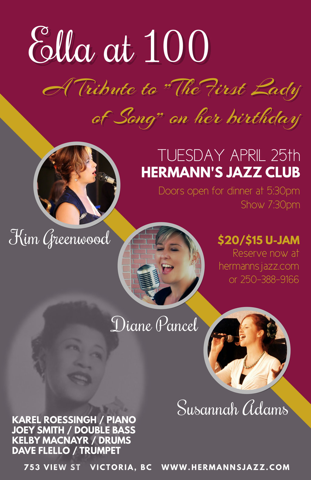 Ella at 100: A Tribute to "The First Lady of Song": Kim Greenwood, Diane Pancel, Susannah Adams @ Hermann's Jazz Club Apr 25 2017 - Feb 12th @ Hermann's Jazz Club