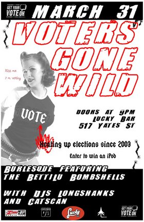 Part of Get Your Vote On (an initiative to get the average voting age to more properly represent the interests of younger Canadians), this is the perfect mix of party and politics, with Hang the DJ residents Catscan and Longshanks, the BettiLu Bombshell Burlesque, an ipod giveaway, and much more.