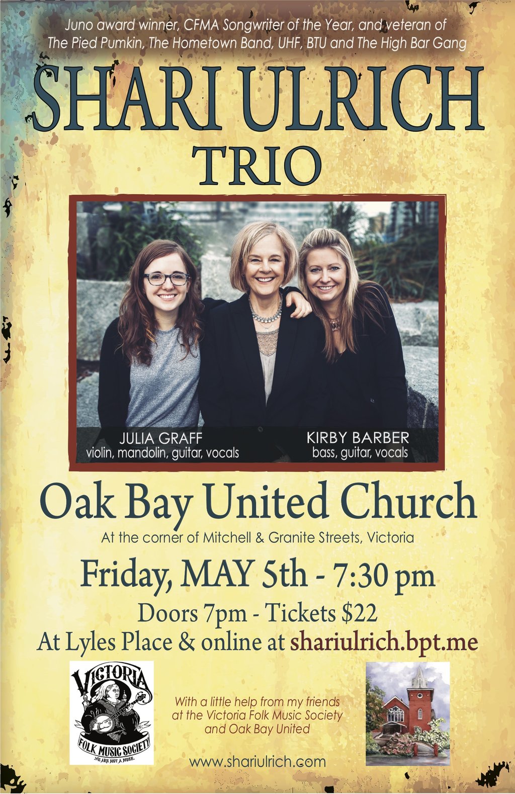 Shari is thrilled to do a concert with her favourite trio of musicians in the beautiful Oak Bay United Church. Featuring a variety of her original songs from 1976 to new unreleased songs, Shari will be performing on piano, guitar, mandolin & violin with her signature spontaneity, warmth and sense of humour and a few new tricks up her sleeve!