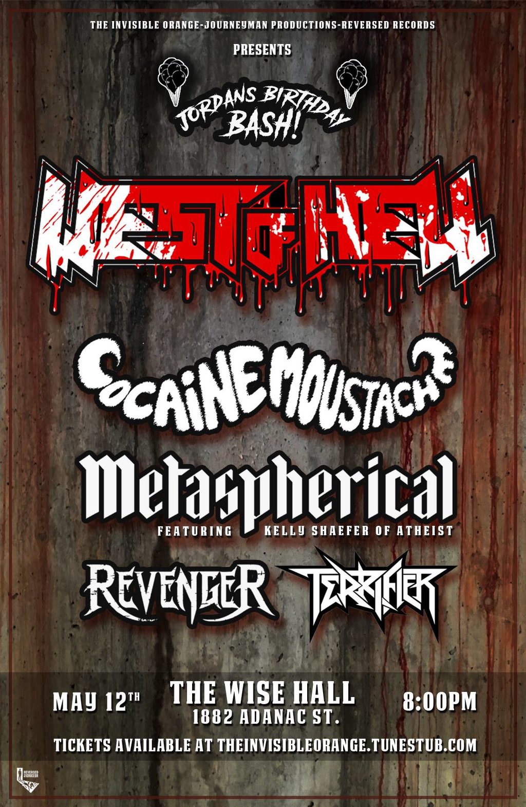 Jordan’s Birthday Bash! West of Hell , Introducing Metaspherical, featuring Kelly Schaefer of Atheist. Also Cocaine Moustache, Revenger, Terrifier