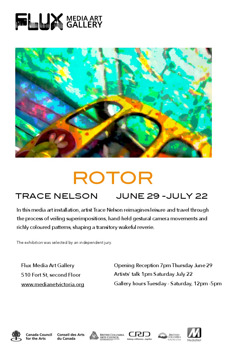 In Rotor, the Dreamer is transported to a place suspended in time, attempting to hold onto an elusive moment that moves, changes and colours our memory in rotating cyclical movements. In this media based installation Trace Nelson reimagines leisure and travel through the process of veiling superimpositions, hand-held turning gestural camera movements and richly coloured patterns shaping a transitory wakeful reverie.