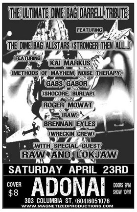 The Ultimate Dimebag Darrell Tribute Featuring.Kai Markus(Methods of Mayhem, Noise Therpy) Gabs Gabor(Shocore, Burlap) Roger Mowat(RAW) Brennan Eyles(Wreckin Crew) With Guest Raw & Lokjaw.Drink Specials Every Saturday $3.25 Heineken Pints, $2.50 Bottles of Canadian, $2.50 Pints.